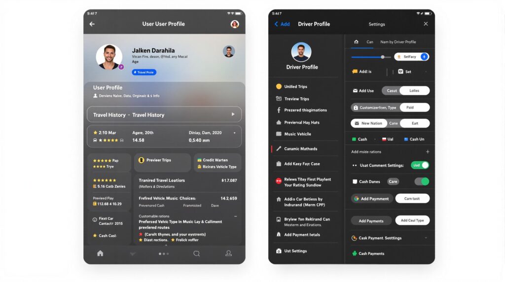Panel de usuario: historial de viajes, pagos, calificaciones y soporte.